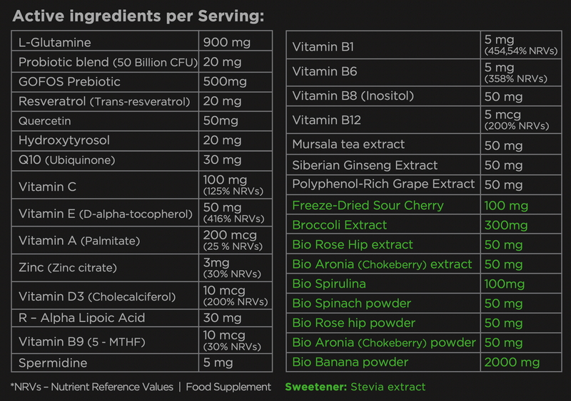 Probiotic Blend, GOFOS Prebiotic, L-Glutamine, Bio Banana Powder, Bio Aronia, Freeze-Dried Sour Cherry, Bio Spinach, Rose Hip Powder